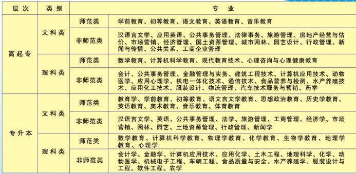 专升本(2门):文科师范类考大学语文、教育与心理学;理科师范类考高等数学、教育与心理学;文科非师范类考大学语文、英语(2);理科非师范类考高等数学、英语(2)