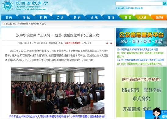 2017年11月25日陕西省教育厅门户网站以《汉中职院发挥“互联网+”优势完成继续教育6万余人次》为题,报道了汉中职业技术学院专业技术人员继续教育培训工作。(详情请点击http://www.snedu.gov.cn/jynews/gdxx/201711/25/73371.html)(组宣部祖萱)编辑/张飏、徐超